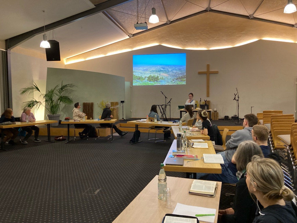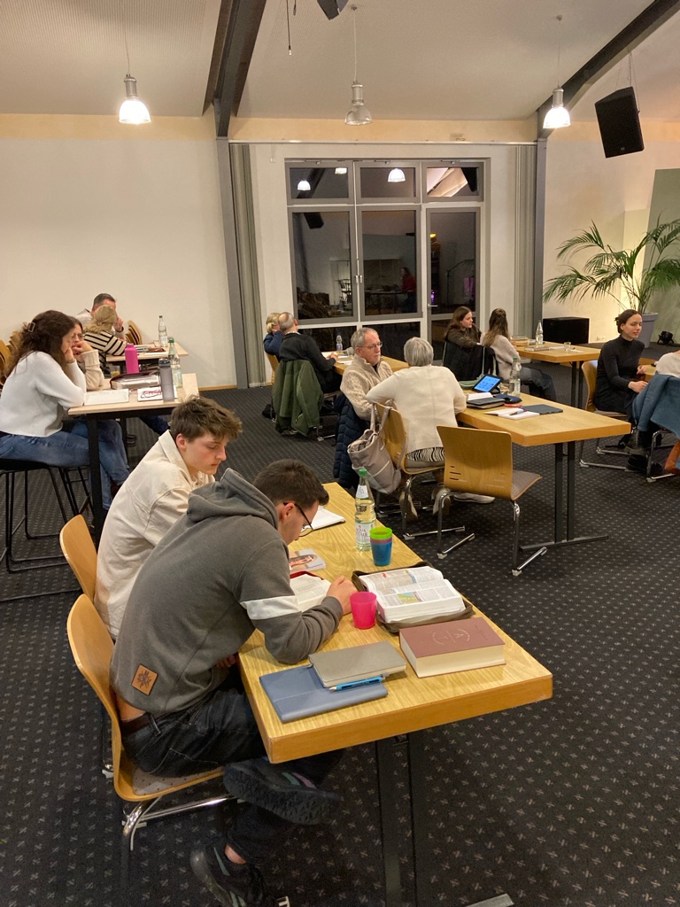 Im Februar füllte sich der Saal einmal pro Woche mit einem großen Tischkreis, an dem jeweils zwei Studienpartner konzentriert miteinander arbeiteten. Die Abende waren geprägt von fokussiertem Lesen, Fragen stellen und vertieftem Lernen im Zweiergespräch. Gleichzeitig entstand in der Gesamtrunde ein bereichernder Austausch, der immer wieder zum Staunen führte und uns voneinander lernen ließ.